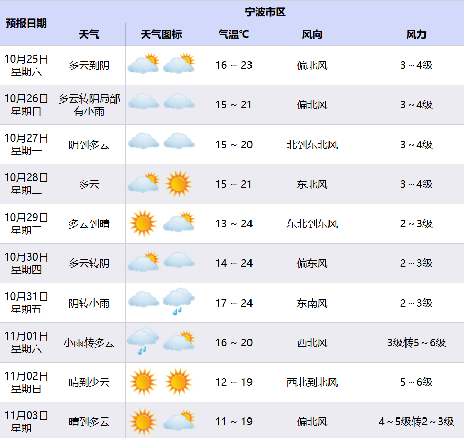 \u003c/p>\u003cp class=\"textAlignCenter\" style=\"text-align: center;\">秋意正濃,天氣多變\u003c/p>\u003cp class=\"textAlignCenter\" style=\"text-align: center;\">接下來\u003c/p>\u003cp class=\"textAlignCenter\" style=\"text-align: center;\">有兩股冷空氣將先后到訪甬城\u003c/p>\u003cp class=\"textAlignCenter\" style=\"text-align: center;\">尤其是下月初的那股\u003c/p>\u003cp class=\"textAlignCenter\" style=\"text-align: center;\">將帶來較明顯的降溫和大風\u003c/p>\u003cp class=\"textAlignCenter\" style=\"text-align: center;\">↓↓\u003c/p>\u003cp>今天,天空云系比較多,最高氣溫在23℃上下,氣溫舒適,適合短途秋游。\u003c/p>\u003cp>明天有弱冷空氣補充,會帶來小幅的降溫和局部的小雨,好在降水不會太明顯,對大家的出行影響不大。\u003c/p>\u003cp class=\"detailPic\">\u003cimg alt=\"60c27409b87f55d02dbf9404118b83d3.jpg\" src=\"https://x0.ifengimg.com/ucms/2025_43/64C43C0C1E6356A7973DC571A50B2670081F0031_size245_w1000_h750.jpg\" />\u003c/p>\u003cp class=\"picIntro\">余姚柿林村“曬秋” 寧波發布特約攝影師 徐繼偉/攝\u003c/p>\u003cp>下周,寧波將迎來幾天秋高氣爽的天氣,秋意也會日漸濃郁起來。10月31日前后受高空槽東移影響,我市有弱降水來擾。\u003c/p>\u003cp>11月初受冷空氣影響,有一次較明顯的降溫和大風過程,屆時寧波的最高氣溫會跌至“1”字頭,提醒大家要根據天氣變化及時調整衣物,謹防感冒。\u003c/p>\u003cp>\u003cimg src=\"https://x0.ifengimg.com/ucms/2025_43/DA5F236AB55CE849779DF5DECC50600995C1FD8F_size125_w904_h854.png\" />\u003c/p>\u003cp class=\"textAlignCenter\">秋天是登山的好時節\u003c/p>\u003cp class=\"textAlignCenter\">出發前\u003c/p>\u003cp class=\"textAlignCenter\">這份《安全登山指南》\u003c/p>\u003cp class=\"textAlignCenter\">請先收下↓\u003c/p>\u003cp>\u003cimg alt=\"640 (2).jpg\" src=\"https://x0.ifengimg.com/ucms/2025_43/D7B0DBA967D99BBCC731B969B8D9E6B41589AF1D_size228_w690_h2128.jpg\" />\u003c/p>\u003cp>來源:寧波發布\u003c/p>","type":"text"}],"currentPage":0,"pageSize":1},"editorName":"謝思潔","faceUrl":"http://ishare.ifeng.com/mediaShare/home/548308/media","vestAccountDetail":{},"subscribe":{"type":"vampire","cateSource":"","isShowSign":0,"parentid":"0","parentname":"社會","cateid":"548308","catename":"鳳凰網寧波","logo":"https://d.ifengimg.com/q100/img1.ugc.ifeng.com/newugc/20201010/11/wemedia/5a68ca01a436772927546cfba868774629fcaea8_size286_w1600_h1600.jpg","description":"鳳凰網寧波頻道,每天向您傳播寧波最新最快新聞資訊。","api":"http://api.3g.ifeng.com/api_wemedia_list?cid=548308","show_link":1,"share_url":"https://share.iclient.ifeng.com/share_zmt_home?tag=home&cid=548308","eAccountId":548308,"status":1,"honorName":"","honorImg":"http://x0.ifengimg.com/cmpp/2020/0907/1a8b50ea7b17cb0size3_w42_h42.png","honorImg_night":"http://x0.ifengimg.com/cmpp/2020/0907/b803b8509474e6asize3_w42_h42.png","forbidFollow":0,"forbidJump":0,"fhtId":"80237075","view":1,"sourceFrom":"","declare":"","originalName":"","redirectTab":"article","authorUrl":"https://ishare.ifeng.com/mediaShare/home/548308/media","newsTime":"2025-10-25 21:30:31","lastArticleAddress":"來自北京"}},"keywords":"寧波,氣溫,降水,秋意,大風,天氣","hasCopyRight":true,"sourceReason":"","isHubeiLocal":false,"interact":{"isCloseShare":false,"isCloseLike":false,"isOpenCandle":false,"isOpenpray":false},"__nd__":"ne883dbn.ifeng.com","__cd__":"c01049em.ifeng.com"};