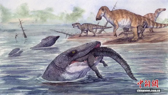 \u003c/p>\u003cp>本項(xiàng)研究的地獄溪滄龍的藝術(shù)復(fù)原圖(圖片作者Christopher DiPiazza)。施普林格·自然 供圖\u003c/p>\u003cp>論文作者認(rèn)為,這項(xiàng)發(fā)研究可能是迄今首個(gè)滄龍?jiān)诿绹鬲z溪(Hell Creek)捕食淡水獵物的證據(jù)。\u003c/p>\u003cp>在本項(xiàng)研究中,論文共同通訊作者、荷蘭阿姆斯特丹自由大學(xué)Melanie A. D. During和美國東部西弗吉尼亞社區(qū)與技術(shù)學(xué)院Nathan E. Van Vranken與同事及合作者一起,對(duì)2022年在美國北達(dá)科他州地獄溪組發(fā)現(xiàn)的牙齒化石進(jìn)行鑒定,該地區(qū)曾是與古代西部內(nèi)陸海道相連的河流區(qū)域。研究人員根據(jù)牙齒表面紋理與同類齒種的相似性,推斷其屬于滄龍亞科傾齒龍類。之前的研究表明,傾齒龍具有粗壯頭骨和強(qiáng)健頜部,主要在海洋中捕獵。\u003c/p>\u003cp>\u003cimg src=\"https://d.ifengimg.com/w700_h576_q90_webp/x0.ifengimg.com/res/2025/987CBEE49901C714E0911ED294E74CBC2C982531_size99_w700_h576.jpg\" alt=\"\" />\u003c/p>\u003cp>左:本項(xiàng)研究的滄龍牙齒化石的不同切面;右:滄龍與霸王龍牙齒并置的原位拍攝照片(圖片來自Melanie During)。施普林格·自然 供圖\u003c/p>\u003cp>論文作者進(jìn)一步通過分析牙齒琺瑯質(zhì)中的同位素,推斷出該種滄龍的生活環(huán)境特征,并發(fā)現(xiàn)其含有的氧同位素與鍶同位素特征與淡水環(huán)境相關(guān)。他們認(rèn)為這可能是滄龍捕食淡水動(dòng)物所致,表明該滄龍能夠在遠(yuǎn)離海洋的環(huán)境中生存和捕獵。研究人員還發(fā)現(xiàn)該牙齒未見遷移痕跡,表明其生前棲息于地獄溪地區(qū)并在該區(qū)域死亡。\u003c/p>\u003cp>論文作者指出,此前地獄溪地區(qū)未發(fā)現(xiàn)同期滄龍牙齒化石。對(duì)更古老的滄龍牙齒及西部內(nèi)陸海道其他動(dòng)物的補(bǔ)充分析顯示,其同位素濃度更符合淡水棲息地特征而非海水環(huán)境,這表明該地區(qū)鹽度隨時(shí)間推移逐漸降低。\u003c/p>\u003cp>\u003cimg src=\"https://d.ifengimg.com/w700_h393_q90_webp/x0.ifengimg.com/res/2025/161AA4E5EDEAFEA2A19AC5096C90AA99D7501525_size56_w700_h393.jpg\" alt=\"\" />\u003c/p>\u003cp>本項(xiàng)研究中,研究人員在地獄溪發(fā)掘現(xiàn)場(chǎng)(圖片來自Trissa Shaw)。施普林格·自然 供圖\u003c/p>\u003cp>論文作者推測(cè),傾齒龍類可能是機(jī)會(huì)主義捕食者,其生態(tài)位與現(xiàn)代灣鱷相似,它們可能因西部內(nèi)陸海道鹽度下降而適應(yīng)淡水環(huán)境,并在水道退卻時(shí)逐漸進(jìn)入地獄溪河道。(完)\u003c/p>","type":"text"}],"currentPage":0,"pageSize":1},"editorName":"謝思潔","faceUrl":"http://ishare.ifeng.com/mediaShare/home/308904/media","vestAccountDetail":{},"subscribe":{"type":"vampire","cateSource":"","isShowSign":0,"parentid":"0","parentname":"社會(huì)","cateid":"308904","catename":"中國新聞網(wǎng)","logo":"http://d.ifengimg.com/q100/img1.ugc.ifeng.com/newugc/20190522/16/wemedia/5302aa5104f23d8d4f5342bace468e275489f5c8_size25_w200_h200.png","description":"中國新聞網(wǎng)官方賬號(hào)","api":"http://api.3g.ifeng.com/api_wemedia_list?cid=308904","show_link":1,"share_url":"https://share.iclient.ifeng.com/share_zmt_home?tag=home&cid=308904","eAccountId":308904,"status":1,"honorName":"","honorImg":"http://x0.ifengimg.com/cmpp/2020/0907/1a8b50ea7b17cb0size3_w42_h42.png","honorImg_night":"http://x0.ifengimg.com/cmpp/2020/0907/b803b8509474e6asize3_w42_h42.png","forbidFollow":0,"forbidJump":0,"fhtId":"4000000044936870623","view":1,"sourceFrom":"","declare":"","originalName":"","redirectTab":"article","authorUrl":"https://ishare.ifeng.com/mediaShare/home/308904/media","newsTime":"2025-12-12 18:25:50","lastArticleAddress":"來自北京"}},"keywords":"滄龍,牙齒,淡水,論文,化石,同位素,海洋,北達(dá)科他州,河流,地獄溪","hasCopyRight":true,"sourceReason":"","isHubeiLocal":false,"interact":{"isCloseShare":false,"isCloseLike":false,"isOpenCandle":false,"isOpenpray":false},"__nd__":"ne883dbn.ifeng.com","__cd__":"c01049em.ifeng.com"};