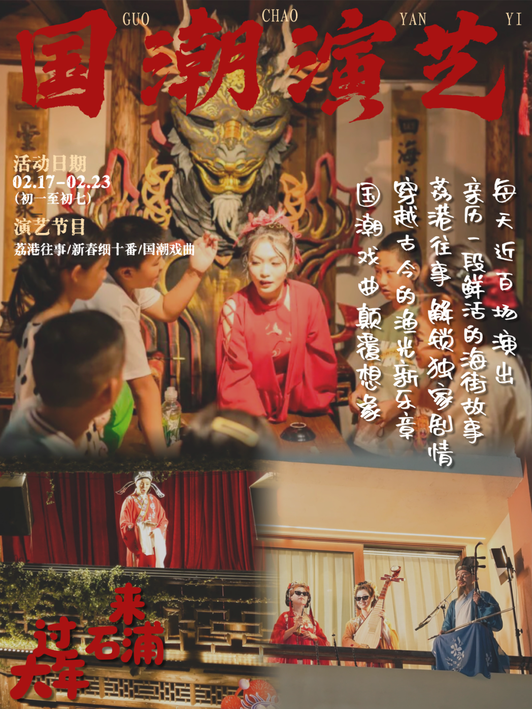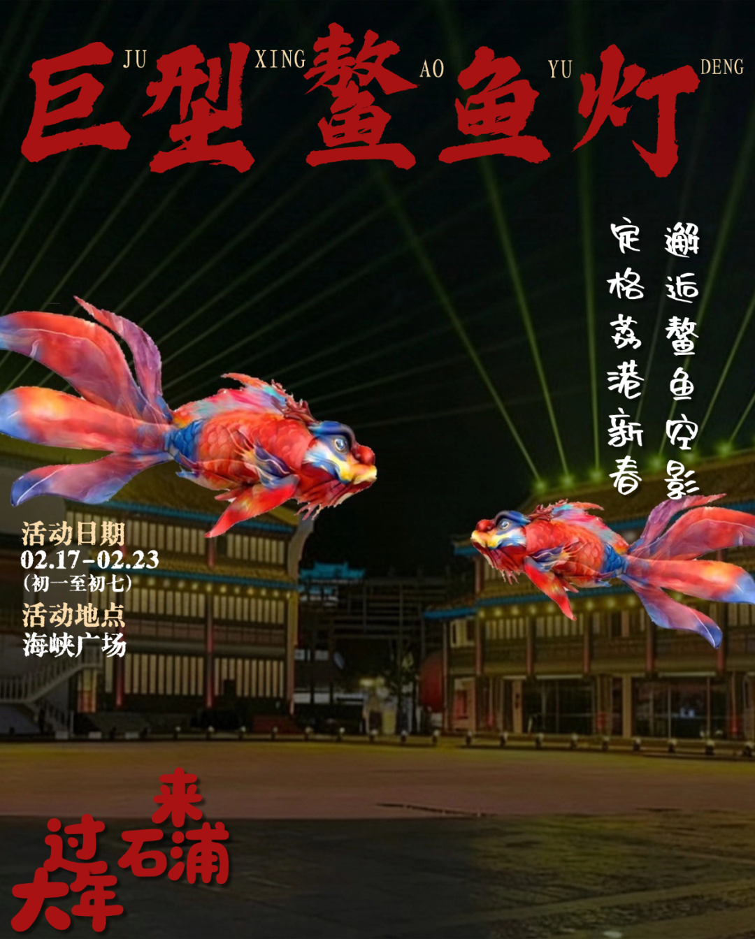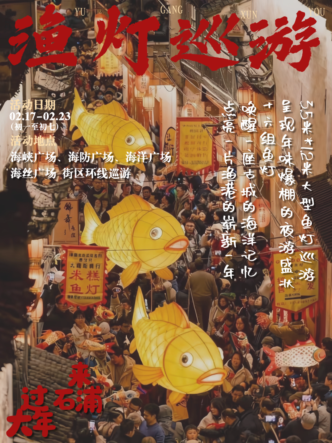 \u003c/p>\u003cp style=\"text-align: center;\">\u003cstrong>漁燈巡游\u003c/strong>\u003c/p>\u003cp style=\"text-align: center;\">\u003cstrong>活動日期\u003c/strong>\u003c/p>\u003cp style=\"text-align: center;\">2月17日—2月23日(初一至初七)\u003c/p>\u003cp style=\"text-align: center;\">\u003cstrong>活動地點\u003c/strong>\u003c/p>\u003cp style=\"text-align: center;\">海峽廣場、海防廣場、海洋廣場\u003c/p>\u003cp style=\"text-align: center;\">海絲廣場 街區環線巡游\u003c/p>\u003cp>\u003cimg src=\"https://x0.ifengimg.com/ucms/2026_05/BE9178D4A6130A45FF10CABCD0EBAD1821DC2B5A_size2275_w1080_h1440.png\" />\u003c/p>\u003cp style=\"text-align: center;\">\u003cstrong>巨型鰲魚燈\u003c/strong>\u003c/p>\u003cp style=\"text-align: center;\">\u003cstrong>活動日期\u003c/strong>\u003c/p>\u003cp style=\"text-align: center;\">2月17日—2月23日(初一至初七)\u003c/p>\u003cp style=\"text-align: center;\">\u003cstrong>活動地點\u003c/strong>\u003c/p>\u003cp style=\"text-align: center;\">海峽廣場\u003c/p>\u003cp>\u003cimg src=\"https://x0.ifengimg.com/ucms/2026_05/85CB420D7A94C65FF59872A03C7E65AFA5B292E8_size1459_w1080_h1344.png\" />\u003c/p>\u003cp style=\"text-align: center;\">\u003cstrong>漁光市集\u003c/strong>\u003c/p>\u003cp style=\"text-align: center;\">\u003cstrong>活動日期\u003c/strong>\u003c/p>\u003cp style=\"text-align: center;\">2月17日—2月23日(初一至初七)\u003c/p>\u003cp style=\"text-align: center;\">\u003cstrong>活動地點\u003c/strong>\u003c/p>\u003cp style=\"text-align: center;\">海防廣場、海絲廣場\u003c/p>\u003cp>\u003cimg src=\"https://x0.ifengimg.com/ucms/2026_05/D721736471247886E1979C9B3D862154C3406B02_size2324_w1080_h1440.png\" />\u003c/p>\u003cp style=\"text-align: center;\">\u003cstrong>游園會\u003c/strong>\u003c/p>\u003cp style=\"text-align: center;\">\u003cstrong>活動日期\u003c/strong>\u003c/p>\u003cp style=\"text-align: center;\">2月17日—2月23日(初一至初七)\u003c/p>\u003cp style=\"text-align: center;\">\u003cstrong>活動地點\u003c/strong>\u003c/p>\u003cp style=\"text-align: center;\">石浦漁港古城老街\u003c/p>\u003cp>\u003cimg src=\"https://x0.ifengimg.com/ucms/2026_05/02BD88E2B077E71DA421C0CF6B92D81A5EDD5393_size2369_w1080_h1440.png\" />\u003c/p>\u003cp style=\"text-align: center;\">\u003cstrong>串門集福\u003c/strong>\u003c/p>\u003cp style=\"text-align: center;\">\u003cstrong>活動日期\u003c/strong>\u003c/p>\u003cp style=\"text-align: center;\">2月17日—2月23日(初一至初七)\u003c/p>\u003cp style=\"text-align: center;\">\u003cstrong>活動地點\u003c/strong>\u003c/p>\u003cp style=\"text-align: center;\">石浦漁港古城\u003c/p>\u003cp>\u003cimg src=\"https://x0.ifengimg.com/ucms/2026_05/F145BC4CEFE5053B86933B47A68979B30D54A67A_size1935_w1080_h1440.png\" />\u003c/p>\u003cp style=\"text-align: center;\">\u003cstrong>國潮演藝\u003c/strong>\u003c/p>\u003cp style=\"text-align: center;\">\u003cstrong>活動日期\u003c/strong>\u003c/p>\u003cp style=\"text-align: center;\">2月17日—2月23日(初一至初七)\u003c/p>\u003cp style=\"text-align: center;\">\u003cstrong>演藝節目\u003c/strong>\u003c/p>\u003cp style=\"text-align: center;\">荔港往事/新春細十番/國潮戲曲\u003c/p>\u003cp>\u003cimg src=\"https://x0.ifengimg.com/ucms/2026_05/84B80991D9AE8E6169B9354028C70C68EE6B597D_size2048_w1080_h1440.png\" />\u003c/p>\u003cp style=\"text-align: center;\">\u003cstrong>戚家軍演藝\u003c/strong>\u003c/p>\u003cp style=\"text-align: center;\">\u003cstrong>活動日期\u003c/strong>\u003c/p>\u003cp style=\"text-align: center;\">2月17日—2月23日(初一至初七)\u003c/p>\u003cp style=\"text-align: center;\">\u003cstrong>表演時間\u003c/strong>\u003c/p>\u003cp style=\"text-align: center;\">上午9:30 下午13:30\u003c/p>\u003cp style=\"text-align: center;\">\u003cstrong>表演地點\u003c/strong>\u003c/p>\u003cp style=\"text-align: center;\">海峽廣場\u003c/p>\u003cp>\u003cimg src=\"https://x0.ifengimg.com/ucms/2026_05/A7F99D258AF582191CA4EF059A42C546AC32D69B_size2171_w1080_h1344.png\" />\u003c/p>\u003cp style=\"text-align: center;\">\u003cstrong>舞龍舞獅\u003c/strong>\u003c/p>\u003cp style=\"text-align: center;\">\u003cstrong>活動日期\u003c/strong>\u003c/p>\u003cp style=\"text-align: center;\">2月17日—2月23日(初一至初七)\u003c/p>\u003cp style=\"text-align: center;\">\u003cstrong>表演時間\u003c/strong>\u003c/p>\u003cp style=\"text-align: center;\">10:10、13:55、15:50、18:30\u003c/p>\u003cp style=\"text-align: center;\">\u003cstrong>表演地點\u003c/strong>\u003c/p>\u003cp style=\"text-align: center;\">甕城\u003c/p>\u003cp>\u003cimg src=\"https://x0.ifengimg.com/ucms/2026_05/732468306C0C5C568939E2E92599721FB809B4E1_size2170_w1080_h1440.png\" />\u003c/p>\u003cp style=\"text-align: center;\">\u003cstrong>玩游戲贏銅錢\u003c/strong>\u003c/p>\u003cp style=\"text-align: center;\">\u003cstrong>活動日期\u003c/strong>\u003c/p>\u003cp style=\"text-align: center;\">2月17日—2月23日(初一至初七)\u003c/p>\u003cp style=\"text-align: center;\">\u003cstrong>活動地點\u003c/strong>\u003c/p>\u003cp style=\"text-align: center;\">關帝廟/源生錢莊/海絲廣場\u003c/p>\u003cp style=\"text-align: center;\">海洋廣場/酒莊/美食展門口\u003c/p>\u003cp>\u003cimg src=\"https://x0.ifengimg.com/ucms/2026_05/525EC3D78C7DBE52B8B36B03BD7DE200267F8C96_size1897_w1080_h1344.png\" />\u003c/p>\u003cp style=\"text-align: center;\">\u003cspan style=\"text-indent: 28px;\">這個春節,不止是歡慶\u003c/span>\u003c/p>\u003cp style=\"text-align: center;\">更是踏入一段被\u003c/p>\u003cp style=\"text-align: center;\">漁光與故事點亮的時光\u003c/p>\u003cp style=\"text-align: center;\">石浦正當時,好戲將開鑼\u003c/p>\u003cp style=\"text-align: center;\">一起共赴最熱血澎湃的中國年\u003c/p>\u003cp>來源:象山發布\u003c/p>","type":"text"}],"currentPage":0,"pageSize":1