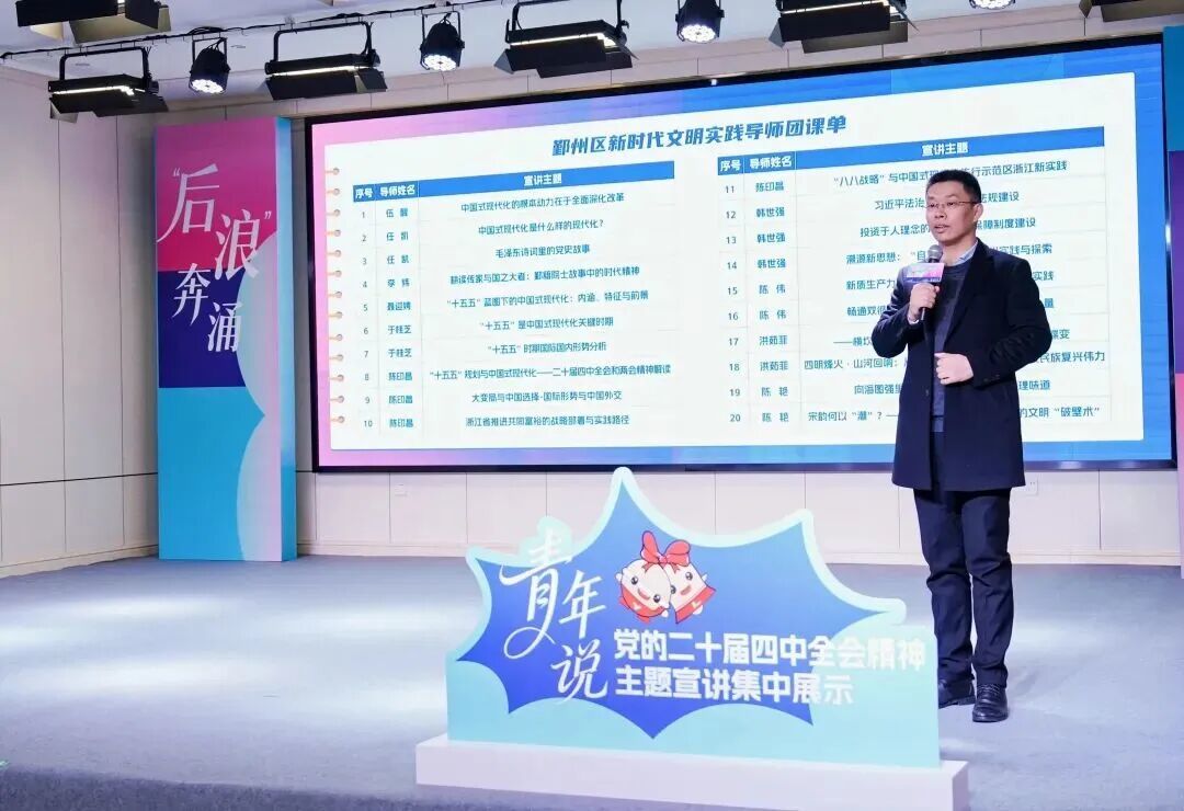 1月29日,鄞州區“后浪”奔涌 理響“鄞鈴”黨的二十屆四中全會精神青年說主題宣講在姜山鎮奉先橋村火熱開講,12名來自鄞州區各行各業的青年宣講員齊聚一堂,以青春視角解碼時代理論,用鄉音土話傳遞政策溫度,讓黨的二十屆四中全會精神走出文件、走進基層。據了解,該宣講活動也是黨的創新理論“百人千場進萬站”文明實踐示范宣講活動。