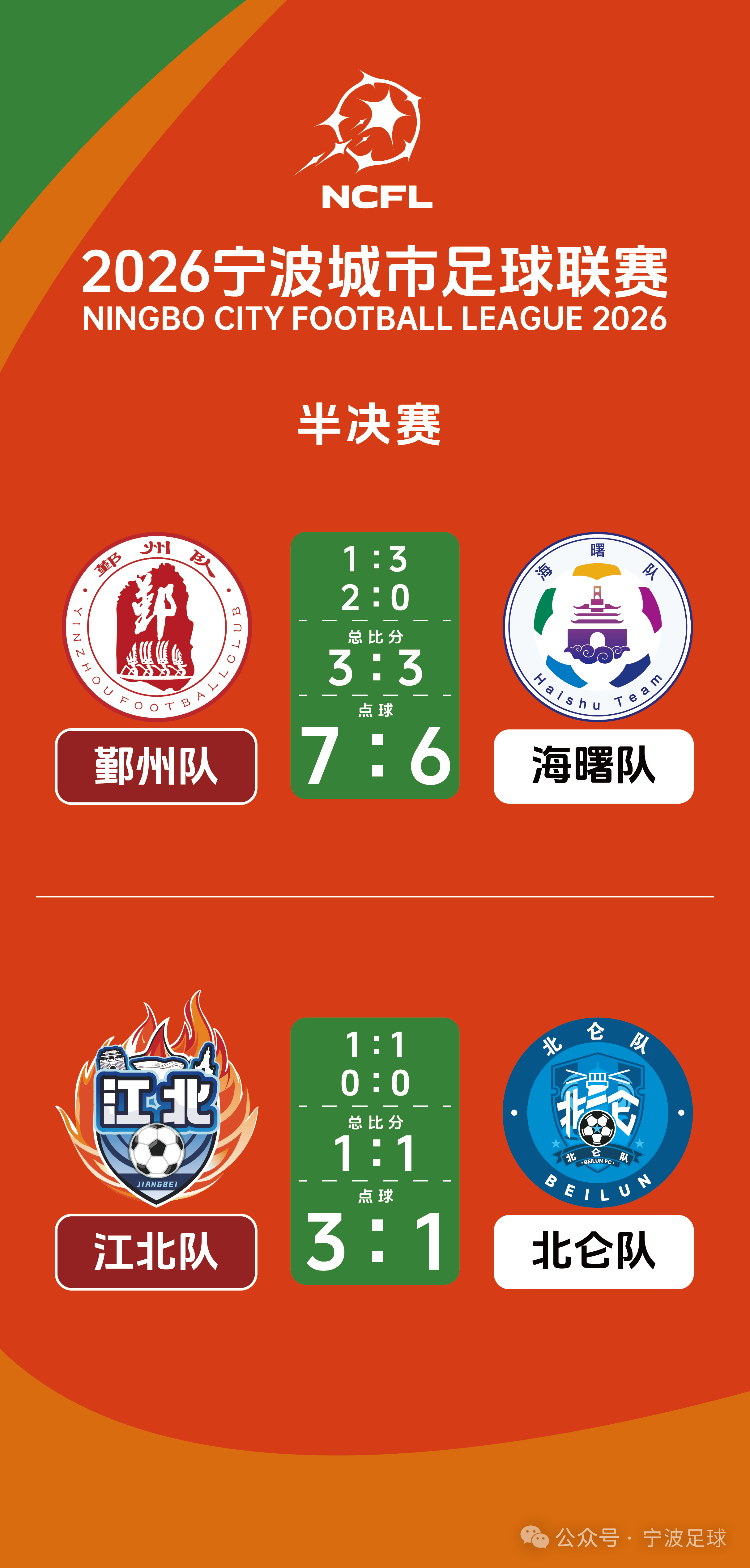 \u003c/p>\u003cp>\u003cimg src=\"https://x0.ifengimg.com/ucms/2026_13/A4D0612C5FF99D2F548BCFAED7C86F4D2C78DC91_size55_w600_h400.jpg\" />\u003c/p>\u003cp class=\"textAlignCenter\">海曙隊(duì)和江北隊(duì)比賽場(chǎng)景。組委會(huì)供圖\u003c/p>\u003cp>3月21日,鄞州隊(duì)實(shí)現(xiàn)逆轉(zhuǎn)翻盤——在半決賽首回合1比3不敵海曙隊(duì)的情況下,第二回合比賽中上半場(chǎng)補(bǔ)時(shí)階段攻入一球,下半場(chǎng)補(bǔ)時(shí)階段再進(jìn)一球,從而把總比分扳為3比3。最后點(diǎn)球大戰(zhàn)中,以7比6驚險(xiǎn)勝出,率先晉級(jí)決賽。\u003c/p>\u003cp>時(shí)隔一天,江北隊(duì)和北侖隊(duì)之間的半決賽第二回合較量,最終也以點(diǎn)球大戰(zhàn)方式收官。這兩支球隊(duì)經(jīng)過90分鐘的激烈拼殺,雙方均無建樹。最終江北隊(duì)依靠門將曹彥博在點(diǎn)球大戰(zhàn)中的神勇發(fā)揮,擊敗客場(chǎng)作戰(zhàn)的北侖隊(duì),以黑馬之姿進(jìn)入本屆城市聯(lián)賽冠軍爭(zhēng)奪戰(zhàn)。\u003c/p>\u003cp>\u003cimg src=\"https://x0.ifengimg.com/ucms/2026_13/68ABAEDAD17E5B8D0C92E87614A813D95A50E91A_size691_w2426_h5075.png\" />\u003c/p>\u003cp>\u003cimg src=\"https://x0.ifengimg.com/ucms/2026_13/410553FDB5A9F5FB3CC18CF5E852AAA9F31F4D98_size490_w2426_h4485.png\" />\u003c/p>\u003cp>此役,江北隊(duì)延續(xù)“上半場(chǎng)重在防守,下半場(chǎng)加強(qiáng)進(jìn)攻”的風(fēng)格,原因是隊(duì)員普遍較為年輕,下半場(chǎng)也有足夠體能沖擊對(duì)方。北侖隊(duì)客場(chǎng)作戰(zhàn),雖然中場(chǎng)大將黃祖旭歸隊(duì)并首發(fā)出場(chǎng),但是也不敢大舉壓上進(jìn)攻。因此,這場(chǎng)球開局階段雙方都顯得比較謹(jǐn)慎。\u003c/p>\u003cp>20分鐘過后,北侖隊(duì)才獲得第一次射門機(jī)會(huì),李慶楊禁區(qū)左側(cè)小角度打門擊中邊網(wǎng),之后江北隊(duì)也“還以顏色”,在對(duì)方禁區(qū)內(nèi)連續(xù)射門,也沒能破門。上半場(chǎng)45分鐘拉鋸戰(zhàn)之后,兩隊(duì)互交白卷。\u003c/p>\u003cp>\u003cimg src=\"https://x0.ifengimg.com/ucms/2026_13/4BC860DC40B6AF7563A6A0FA7646E7A0D9B2A545_size68_w600_h400.jpg\" />\u003c/p>\u003cp>\u003cimg src=\"https://x0.ifengimg.com/ucms/2026_13/9912FB9AB6593D766C8AACA26DCCE137411C1C31_size54_w600_h400.jpg\" />\u003c/p>\u003cp class=\"detailPic\">\u003cimg src=\"https://x0.ifengimg.com/ucms/2026_13/33062DAF5B9E2D64573BDC56AFD8EC190DB74850_size46_w600_h400.jpg\" alt=\"鄞州隊(duì)、江北隊(duì)爭(zhēng)冠!寧波城市足球聯(lián)賽決賽對(duì)陣出爐\" />\u003cspan style=\"font-family: 楷體_gb2312, 楷體, SimKai, "Kaiti SC"; font-size: 14px; text-align: left; text-indent: 0px;\">北侖隊(duì)和江北隊(duì)比賽場(chǎng)景。記者 崔引 攝\u003c/span>\u003c/p>\u003cp>下半場(chǎng),江北隊(duì)明顯加強(qiáng)攻勢(shì),利用年輕人的體力優(yōu)勢(shì),頻繁從兩個(gè)邊路沖擊北侖隊(duì)防線。第56分鐘,江北隊(duì)右路起球,盧中磊門柱邊空門頂高,錯(cuò)失絕佳進(jìn)球機(jī)會(huì)。第61分鐘,北侖隊(duì)李慶楊斷球后形成單刀,但是被對(duì)方后衛(wèi)鏟球化解了危機(jī)。臨近比賽結(jié)束,北侖隊(duì)還獲得兩次得分良機(jī),不過江北隊(duì)門將曹彥博表現(xiàn)出色,力保球門不失。隨著主裁終場(chǎng)哨響,兩支球隊(duì)不得不進(jìn)入到殘酷的點(diǎn)球大戰(zhàn)。\u003c/p>\u003cp>\u003cimg src=\"https://x0.ifengimg.com/ucms/2026_13/09679B789140312042EFB08F0AD7D4A554F7C0F4_size46_w600_h400.jpg\" />\u003c/p>\u003cp>\u003cimg src=\"https://x0.ifengimg.com/ucms/2026_13/3943ED3380E4AB596E001C68136D45F7737966C6_size41_w600_h399.jpg\" />\u003c/p>\u003cp class=\"detailPic\">\u003cimg src=\"https://x0.ifengimg.com/ucms/2026_13/1273BFDABA00EFCB0F197A5707446843DA1FAF66_size39_w600_h400.jpg\" alt=\"鄞州隊(duì)、江北隊(duì)爭(zhēng)冠!寧波城市足球聯(lián)賽決賽對(duì)陣出爐\" />\u003cspan style=\"font-family: 楷體_gb2312, 楷體, SimKai, "Kaiti SC"; font-size: 14px; text-align: left; text-indent: 0px;\">北侖隊(duì)和江北隊(duì)比賽場(chǎng)景。記者 崔引 攝\u003c/span>\u003c/p>\u003cp>點(diǎn)球大戰(zhàn)過程中,北侖隊(duì)第二位出場(chǎng)球員射門高出橫梁,江北隊(duì)第三位出場(chǎng)隊(duì)員射門被撲住,北侖隊(duì)第三位出場(chǎng)球員射門也被撲住,北侖隊(duì)第四位出場(chǎng)球員擊中橫梁。至此,江北隊(duì)在主場(chǎng)贏得點(diǎn)球大戰(zhàn),和鄞州隊(duì)會(huì)師決賽。\u003c/p>","type":"text"}],"currentPage":0,"pageSize":1},"editorName":"謝思潔","faceUrl":"http://ishare.ifeng.com/mediaShare/home/548308/media","vestAccountDetail":{},"subscribe":{"type":"vampire","cateSource":"","isShowSign":0,"parentid":"0","parentname":"社會(huì)","cateid":"548308","catename":"鳳凰網(wǎng)寧波","logo":"https://d.ifengimg.com/q100/img1.ugc.ifeng.com/newugc/20201010/11/wemedia/5a68ca01a436772927546cfba868774629fcaea8_size286_w1600_h1600.jpg","description":"鳳凰網(wǎng)寧波頻道,每天向您傳播寧波最新最快新聞資訊。","api":"http://api.3g.ifeng.com/api_wemedia_list?cid=548308","show_link":1,"share_url":"https://share.iclient.ifeng.com/share_zmt_home?tag=home&cid=548308","eAccountId":548308,"status":1,"honorName":"","honorImg":"http://x0.ifengimg.com/cmpp/2020/0907/1a8b50ea7b17cb0size3_w42_h42.png","honorImg_night":"http://x0.ifengimg.com/cmpp/2020/0907/b803b8509474e6asize3_w42_h42.png","forbidFollow":0,"forbidJump":0,"fhtId":"80237075","view":1,"sourceFrom":"","declare":"","originalName":"","redirectTab":"article","authorUrl":"https://ishare.ifeng.com/mediaShare/home/548308/media","newsTime":"2026-
