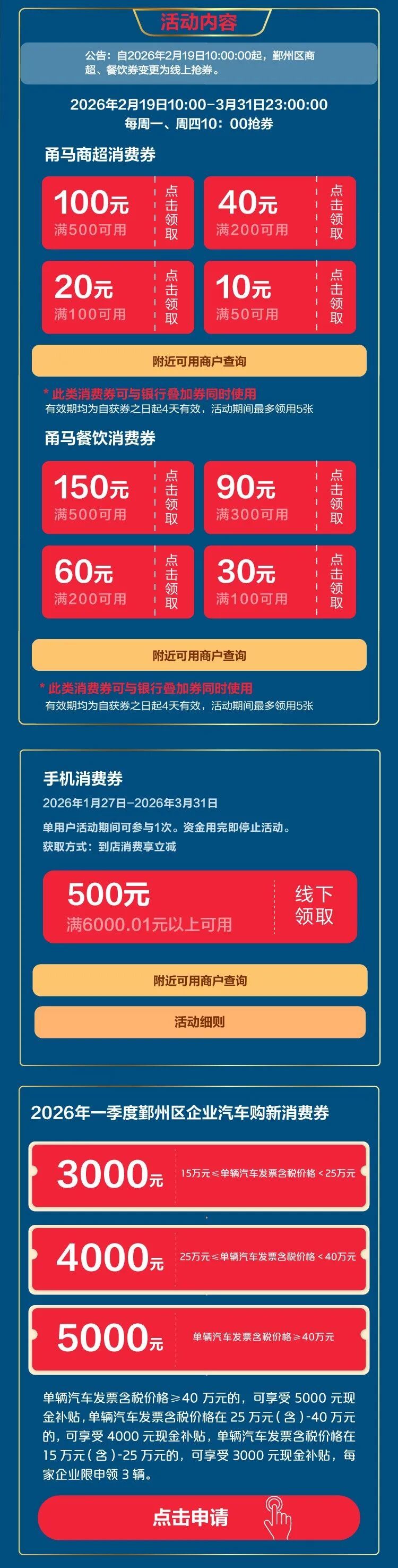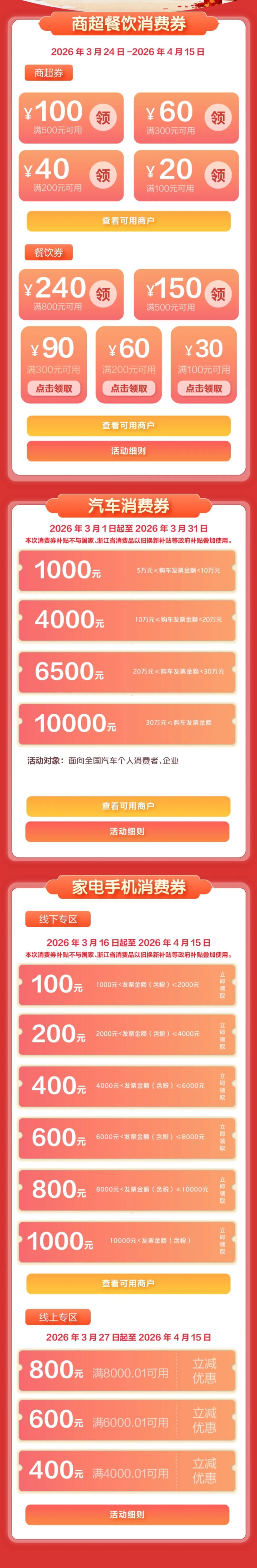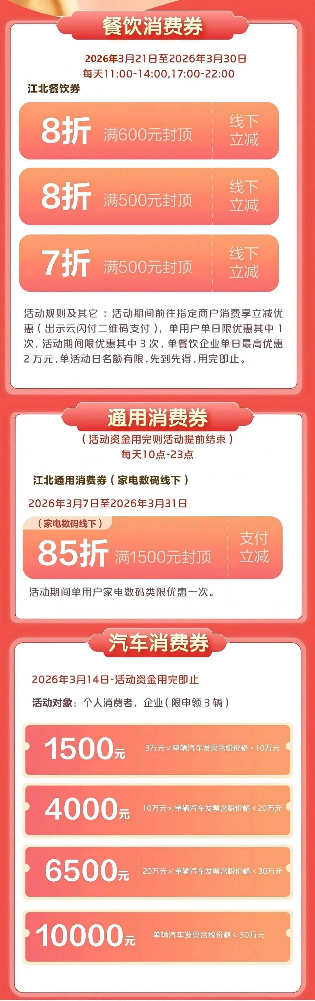 \u003c/p>\u003cp>江北本期共設餐飲消費券、通用消費券、汽車消費券。\u003c/p>\u003cp>\u003cstrong>領券路徑:\u003c/strong>打開云閃付App(定位寧波市),點擊“市縣消費券”,選擇“江北區(qū)”。\u003c/p>\u003cp>*具體參加商戶以云閃付“可用商戶名單”為準\u003c/p>\u003cp>\u003cimg src=\"https://x0.ifengimg.com/ucms/2026_13/C7C074599D3E42FB8073A61388AE613D4609097D_size342_w1080_h3423.jpg\" />\u003c/p>\u003cp>\u003cimg alt=\"活動限時特惠宣傳扁平風公眾號小圖__2026-03-24+12_32_37.png\" src=\"https://x0.ifengimg.com/ucms/2026_13/E4D6CD46C71A25605A2FB04CE28EC8806C8B6EA8_size28_w712_h133.png\" />\u003c/p>\u003cp>鄞州本期共設商超消費券、餐飲消費券、手機消費券、汽車消費券、小象超市消費券。\u003c/p>\u003cp>\u003cstrong>領券路徑:\u003c/strong>打開云閃付App(定位寧波市),點擊“市縣消費券”,選擇“鄞州區(qū)”。\u003c/p>\u003cp>*具體參加商戶以云閃付“可用商戶名單”為準\u003c/p>\u003cp>\u003cimg src=\"https://x0.ifengimg.com/ucms/2026_13/55BE83912F7D44BE8C62F09693D2003A8D5E0EF8_size276_w750_h2952.jpg\" />\u003c/p>\u003cp style=\"text-align: center;\">\u003cstrong style=\"text-align: center; text-indent: 28px;\">小象超市消費券\u003c/strong>\u003c/p>\u003cp>小象超市消費券分為滿50元減10元,滿100元減20元、滿200元減40元等面額。市民和游客可從美團平臺進入“小象超市”頻道,搜索“鄞州消費券”進入活動界面領券,消費者每人每天每個面額的券均可領取1張,先到先得,領完為止,當天領取當天使用,不可疊加使用。\u003c/p>\u003cp>\u003cimg alt=\"0ad13f54fefc7df138afe338b6ab030d.png\" src=\"https://x0.ifengimg.com/ucms/2026_13/2C5EA95453BBD4E55472B9CD5E9C0C31D8A833BC_size713_w750_h1191.png\" />\u003c/p>\u003cp>\u003cimg alt=\"活動限時特惠宣傳扁平風公眾號小圖__2026-03-24+12_46_15.png\" src=\"https://x0.ifengimg.com/ucms/2026_13/7FB9AEA430A2A6E47AEC41B4ADC8C35406BDB162_size26_w712_h133.png\" />\u003c/p>\u003cp>北侖本期共設餐飲消費券、超市消費券、商圈消費券、跨境自提消費券、汽車消費券。\u003c/p>\u003cp>\u003cstrong>領券路徑:\u003c/strong>打開云閃付App(定位寧波市),點擊“市縣消費券”,選擇“北侖區(qū)”。\u003c/p>\u003cp>*具體參加商戶以云閃付“可用商戶名單”為準\u003c/p>\u003cp>\u003cimg alt=\"1f32e7b98ccadac3fc36ee9a21138e90.jpg\" src=\"https://x0.ifengimg.com/ucms/2026_13/9EC3F299FEFB1FAEE8B5C7E335FF89A3DB53B683_size723_w1080_h7398.jpg\" />\u003c/p>\u003cp>\u003cimg alt=\"活動限時特惠宣傳扁平風公眾號小圖__2026-03-24+13_16_43.png\" src=\"https://x0.ifengimg.com/ucms/2026_13/88B847DDC91A98AE27077660F236693FF29978D0_size28_w712_h133.png\" />\u003c/p>\u003cp>鎮(zhèn)海本期共設汽車消費券、購車保險券、餐飲消費券。\u003c/p>\u003cp>\u003cstrong>領券路徑:\u003c/strong>打開云閃付App(定位寧波市),點擊“市縣消費券”,選擇“鎮(zhèn)海區(qū)”。\u003c/p>\u003cp>*具體參加商戶以云閃付“可用商戶名單”為準\u003c/p>\u003cp>\u003cimg alt=\"06166d834bdef04cc5faaeb1e73cb5be.jpg\" src=\"https://x0.ifengimg.com/ucms/2026_13/3D077C3194F9F05DBEA3EF1F24A1A2A618653573_size359_w1080_h4273.jpg\" />\u003c/p>\u003cp>\u003cimg alt=\"活動限時特惠宣傳扁平風公眾號小圖__2026-03-24+12_48_41.png\" src=\"https://x0.ifengimg.com/ucms/2026_13/43AC9BDC29545B2B83A97DBC8639773289125C21_size27_w712_h133.png\" />\u003c/p>\u003cp>象山本期共設商超餐飲消費券、汽車消費券、家電手機消費券。\u003c/p>\u003cp>\u003cstrong>領券路徑:\u003c/strong>打開云閃付App(定位寧波市),點擊“市縣消費券”,選擇“象山縣”。\u003c/p>\u003cp>*具體參加商戶以云閃付“可用商戶名單”為準\u003c/p>\u003cp>\u003cimg src=\"https://x0.ifengimg.com/ucms/2026_13/DC12150C6EC5131E43DED524BE040E3EA8AFA2E8_size524_w1080_h6589.jpg\" />\u003c/p>\u003cp class=\"textAlignCenter\">\u003cimg src=\"https://x0.ifengimg.com/ucms/2026_13/E903DD9CB98B1917D94FE4556C2A6B8A19FDEBC0_size189_w240_h240.gif\" />\u003c/p>\u003cp class=\"textAlignCenter\">小伙伴們快去領券,\u003c/p>\u003cp class=\"textAlignCenter\">讓我們一起吃遍美食、逛遍商圈,\u003c/p>\u003cp class=\"textAlignCenter\">省錢還能嗨翻天!\u003c/p>\u003cp class=\"textAlignCenter\" style=\"text-align: left;\">來源:寧波商務\u003c/p>","type":"text"}],"currentPage":0,"pageSize":1},"editorName":"謝思潔","faceUrl":"http://ishare.ifeng.com/mediaShare/home/373005/media","vestAccountDetail":{},"subscribe":{"type":"vampire","cateSource":"","isShowSign":0,"parentid":"0","parentname":"財經","cateid":"373005","catename":"每日經濟新聞","logo":"","description":"","api":"http://api.3g.ifeng.com/api_wemedia_list?cid=373005","show_link":1,"share_url":"https://share.iclient.ifeng.com/share_zmt_home?tag=home&cid=373005","eAccountId":373005,"status":1,"honorName":"","honorImg":"","honorImg_night":"","forbidFollow":1,"forbidJump":1,"fhtId":"76962969","view":1,"sourceFrom":"","declare":"","originalName":"","redirectTab":"article","authorUrl":"https://ishare.ifeng.com/mediaShare/home/373005/media","newsTime":"2026-03-25 09:08:12","lastArticleAddress":"來自北京"}},"keywords":"消費券,商戶,寧波市,市縣,路徑,餐飲,app,江北","hasCopyRight":true,"sourceReason":"","isHubeiLocal":false,"interact":{"isCloseShare":false,"isCloseLike":false,"isOpenCandle":false,"isOpenpray":false},"__nd__":"ne883dbn.ifeng.com","__cd__":"c01049em.ifeng.com"};