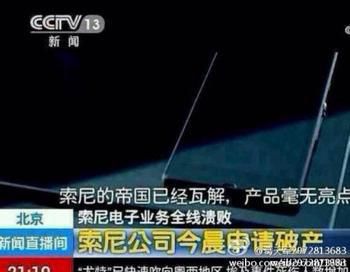 18日夜間,有網友發布了疑似央視新聞頻道的“截圖”,稱索尼申請破產,截圖顯示,新聞主標題是《索尼公司申請破產》,副標題則是《索尼電子業務全線潰敗》,正在播出的字幕為“索尼的帝國已經瓦解,產品毫無亮點”,該截圖一發出就引起了網友的熱議,大多數網友對此將信將疑。