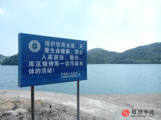 慈溪上林湖水庫邊上立著“禁止入庫游泳、垂釣”警示牌