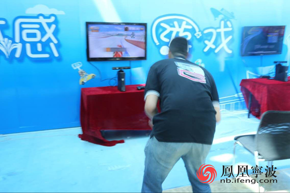 游客在體感游戲區體驗“滑雪比賽”的樂趣。