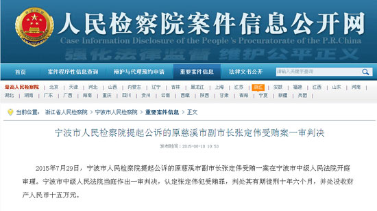 慈溪市原副市長張定偉犯受賄罪一審獲刑10年6個月