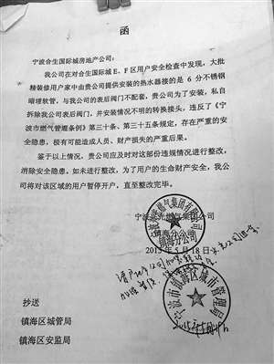 我公司在對合生國際城E、F區用戶安全檢查中發現,大批精裝修用戶家中由貴公司提供安裝的熱水器接的是6分不銹鋼暗埋軟管,與我公司的表后閥門不配套,貴公司為了安裝,私自拆除我公司表后閥門,并安裝情況不明的轉換接頭,違反了《寧波市燃氣管理條例》第三十條、第三十五條規定,存在嚴重的安全隱患,極有可能造成人員、財產損失的嚴重后果。