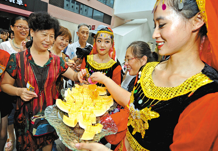 上午10時,伴隨著熱情洋溢的西域風情舞蹈,錢湖天地廣場里人氣越聚越旺。市民一邊欣賞舞蹈,一邊看視頻了解甜瓜的生產(chǎn)、采收過程,并排起長隊品嘗甜瓜。