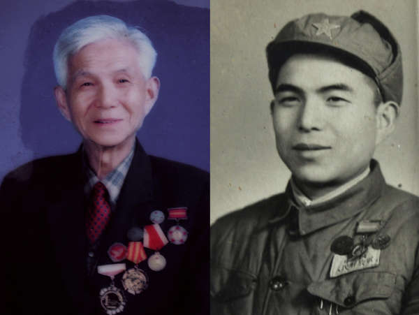 圖片說明:左為2005年,王明才佩帶他參加淮海戰役、渡江戰役、解放戰爭和抗美援朝而榮獲的獎章留影。右為1956年,王明才佩帶他參加解放戰爭而榮獲的解放獎章留影。(選自《王明才家庭影集》)