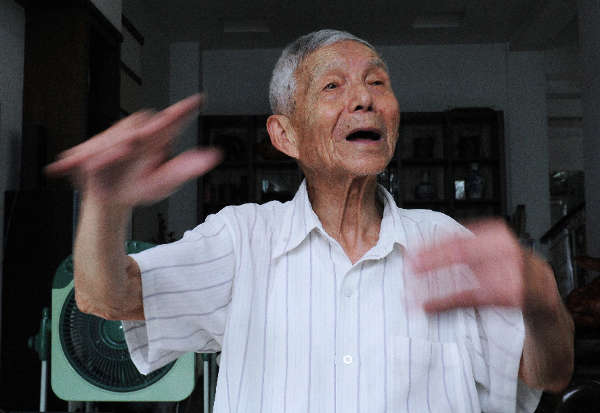 王明才向家人打拍子演唱《新四軍軍歌》——“東進,東進!我們是鐵的新四軍!……”。70多年前,王明才曾無數遍唱著這首軍歌轉戰江南。