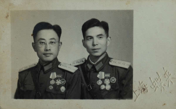 圖片說明:左為2005年,王明才佩帶他參加淮海戰役、渡江戰役、解放戰爭和抗美援朝而榮獲的獎章留影。(選自《王明才家庭影集》) 1956年,被授予上尉軍銜的王明才(右)與戰友在上海一家照相館拍攝的合影。