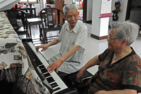 王明才(左)和老伴何秀娟在家里切磋鋼琴彈奏技法。他們結婚60年來,王明才向曾是幼兒園老師的妻子學會了彈鋼琴。