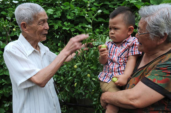 王明才(左)和老伴何秀娟在自家院子里與1歲的曾外孫季庭軒玩耍。