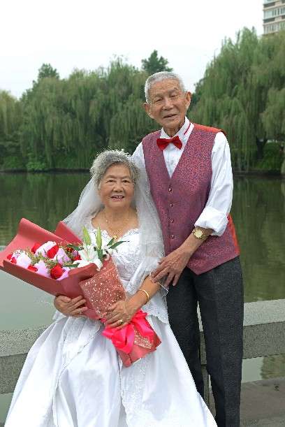2014年國慶前夕,王明才(右)和老伴何秀娟在義烏拍攝紀念60年鉆石婚慶的婚紗照。(選自《王明才家庭影集》)