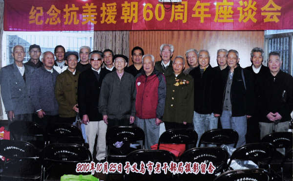 2010年10月25日,王明才(前左五)參加在義烏舉行的“紀念抗美援朝60周年座談會”。(選自《王明才家庭影集》)
