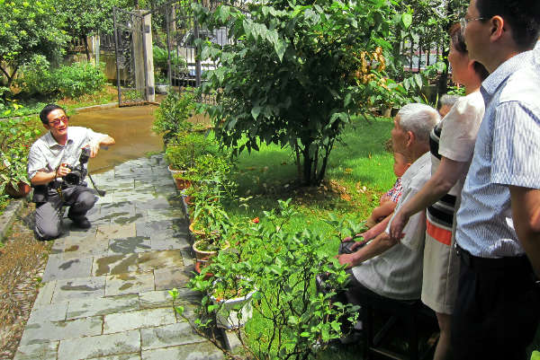 圖為新華社高級記者譚進(左一)在采訪91歲的新四軍老兵王明才(前右三)。這是他為老兵拍攝全家福前的交流情景。