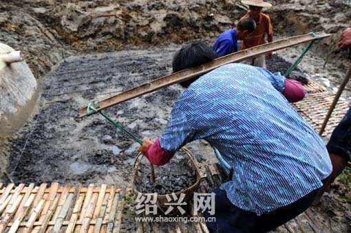 前兩天是臺風天,時常下雨,諸暨次塢鎮吳高塢村的田埂小路全是泥濘,異常溜滑的地上,一擔一擔的水泥(約120斤),被身材矮小的64歲村民吳幼文奶奶,一趟又一趟地來回挑起.....