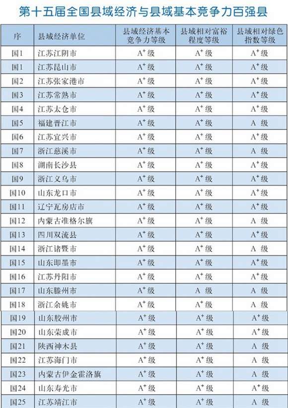 2015中國百強(qiáng)縣1-25名
