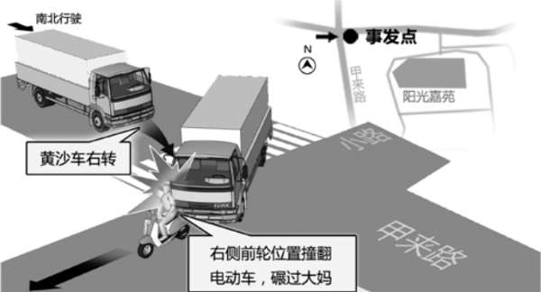 昨天上午10點多,三墩陽光嘉苑小區外道路——甲來路的一個十字路口,一輛運送渣土的大型黃沙車,由南向東右轉過路口時,撞上了前頭一輛電動車。