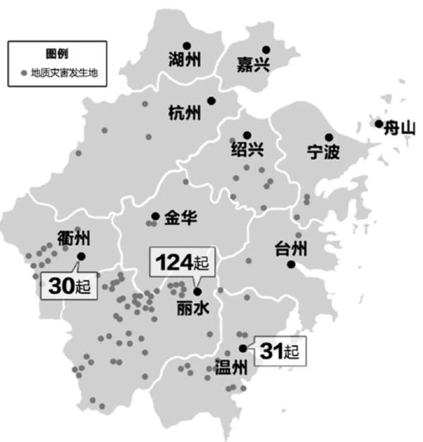 從地域分布來看,以浙西北、浙西南、浙南的丘陵地區為主,其中杭州、溫州、金華、麗水、衢州五個市6至9月間發生的地質災害數占全省的84%。