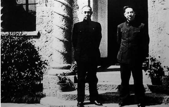 西安事變后,為實(shí)現(xiàn)全民族抗戰(zhàn),1937年3月,周恩來(lái)代表中共中央與蔣介石在杭州舉行國(guó)共合作抗日談判。圖為周恩來(lái)(左)與國(guó)民黨談判聯(lián)絡(luò)代表張沖在杭州談判地點(diǎn)之一——柏廬。