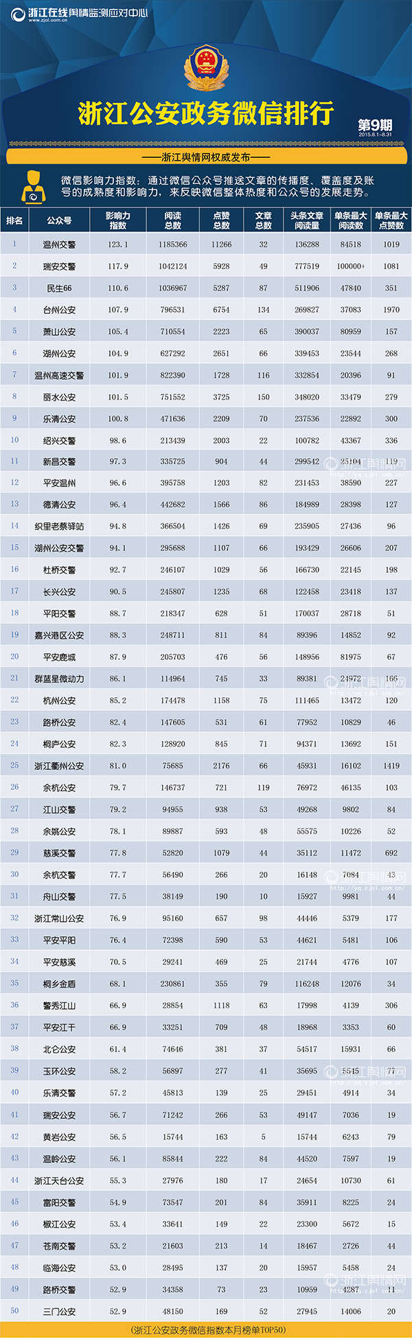 一起來看本期成績:8月,216個賬號的總發文數為6010篇,略低于上月的6547篇,閱讀總數則由上月的12820508增至13868735。排名方面,前三名“鐵三角”首次發生變動:“溫州交警”沖頂成功,“瑞安交警”、“民生66”分獲第二、三名。“臺州公安”降至第四名,“麗水公安”首次進入前十并獲得第八名,另有“蕭山公安”、“湖州公安”、“溫州高速交警”、“樂清公安”、“紹興交警”保十成功。與上期相比,除各自排名有所調整,其余變化不大。