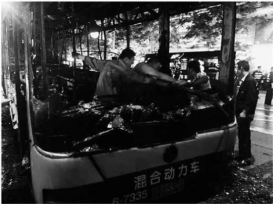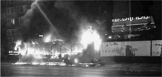 三四分鐘后,整輛公交車被大火團團包住。