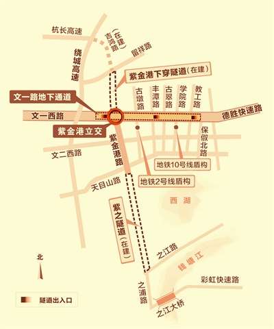 文一路地下通道全長(zhǎng)5.2公里,向西與紫金港路立交相接,連通紫之隧道,往東與德勝快速路相接,預(yù)計(jì)到2018年年中建成。