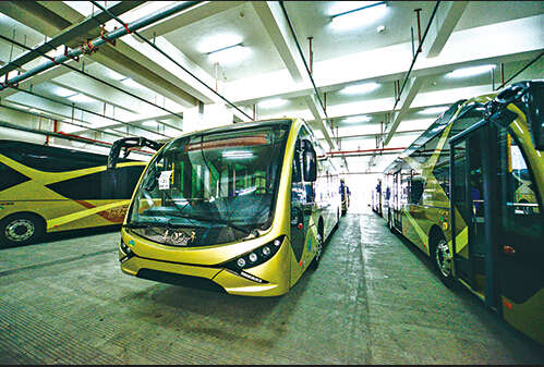 昨天下午記者來到BRT停車場,里面停著10多輛BRT公交車,首批有12米和18米兩種車型。從外形上看,溫州BRT公交和普通公交車最大的不同,便是BRT公交車那類似和諧號動車的“子彈頭”車頭。車身上印有顯著的BRT標志,全車顏色為啞金色和黑色,看上去相當酷炫。